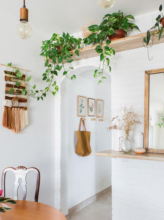 Небольшой стеллаж или книжные полки будут отлично смотреться с маленькими необычными горшками. Особенно красиво и стильно смотрятся свисающие растения, такие как хойя, плющ, потос, очиток Моргана или крестовник Роули (те самые свисающие суккуленты). К тому же горшки можно использовать, чтобы подпереть книги.