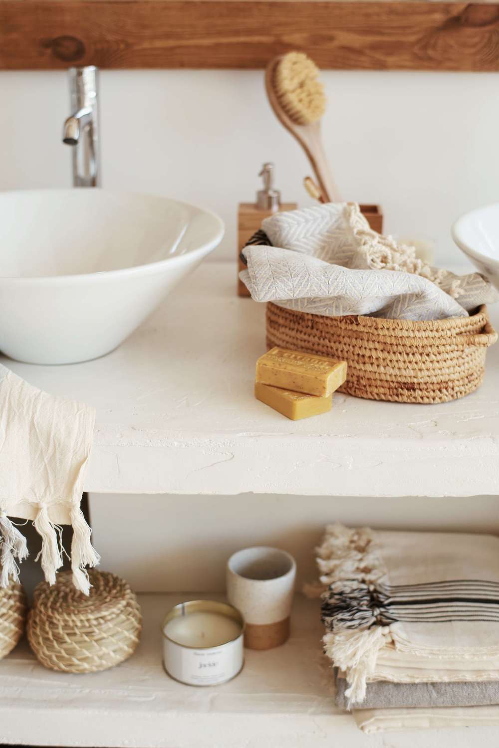 Аналогично кухне, яркая пластиковая упаковка - некрасиво и неэкологично. Попробуйте купить керамическую тарелочку под ароматное мыло "брикетом", убрать все кремы в зеркальный шкафчик или корзинку (Ikea, Afro Home или H&M Home), а шампунь изготовите сами или купите